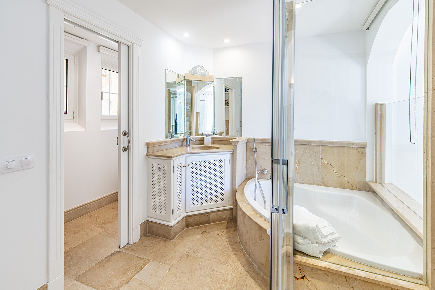 Amplio piso con jardín, gran salón/comedor, cocina, cocina totalmente equipada (Poggenpohl) con electrodomésticos empotrados Küppersbusch, lavadero, 1 dormitorio, 1 baño en suite, calefacción por suelo radiante en todo el piso (bomba de calor), aire acondicionado central frío/calor, chimenea, ventanas de doble acristalamiento (aluminio), persianas (aluminio), suelos de mármol Antiguar, ascensor, 1 plaza de aparcamiento subterráneo, dos fantásticas zonas de piscina al aire libre, zona de bienestar (piscina cubierta climatizada, zona de sauna, jacuzzi, gimnasio), servicio de conserjería, servicio de seguridad y mucho más....